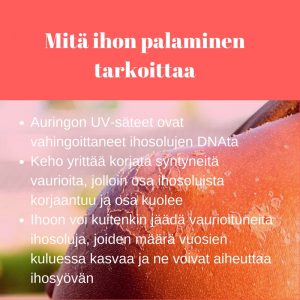 Mikä palamisen aiheuttaa? Kaikki rusketus tai punoitus iholla on merkki siitä, että UV-säteily, on se sitten peräisin auringosta tai solariumista, on vaurioittanut geneettistä materiaalia (DNA) ihosoluissasi. UV-vaurioiden syntyyn ei tarvita vakavia auringonpolttamia. Lievemmätkin vauriot ihon DNAssa voivat johtaa ihosyöpään.